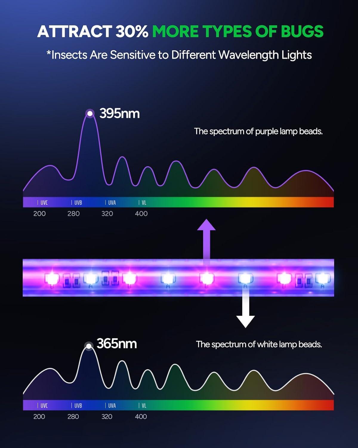 Enhanced LED Attraction: The bug zapper uses a combination of two peak wavelength LED beads at 365nm and 395nm. Therefore, you will see two different colors of our LED beads. The dual-color LED system increases insect attraction by 30%, making it especially effective in low-light or nocturnal environments.(Recommended for use only in low light or darkness, as daylight or bright light reduces its effectiveness.)